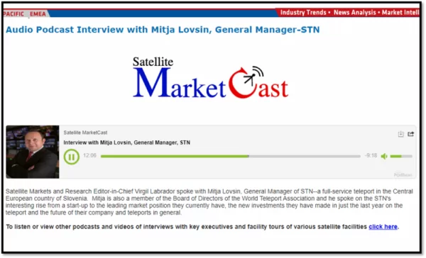 The long term business relationship. In a series of four short videos, STN’s General Manager Mitja Lovšin chats with Intelsat’s EMENA Regional Vice President about the companies strong long-term business relationship, innovation, and Galaxy19 Satellite. STN Teleport Channel- YouTube
